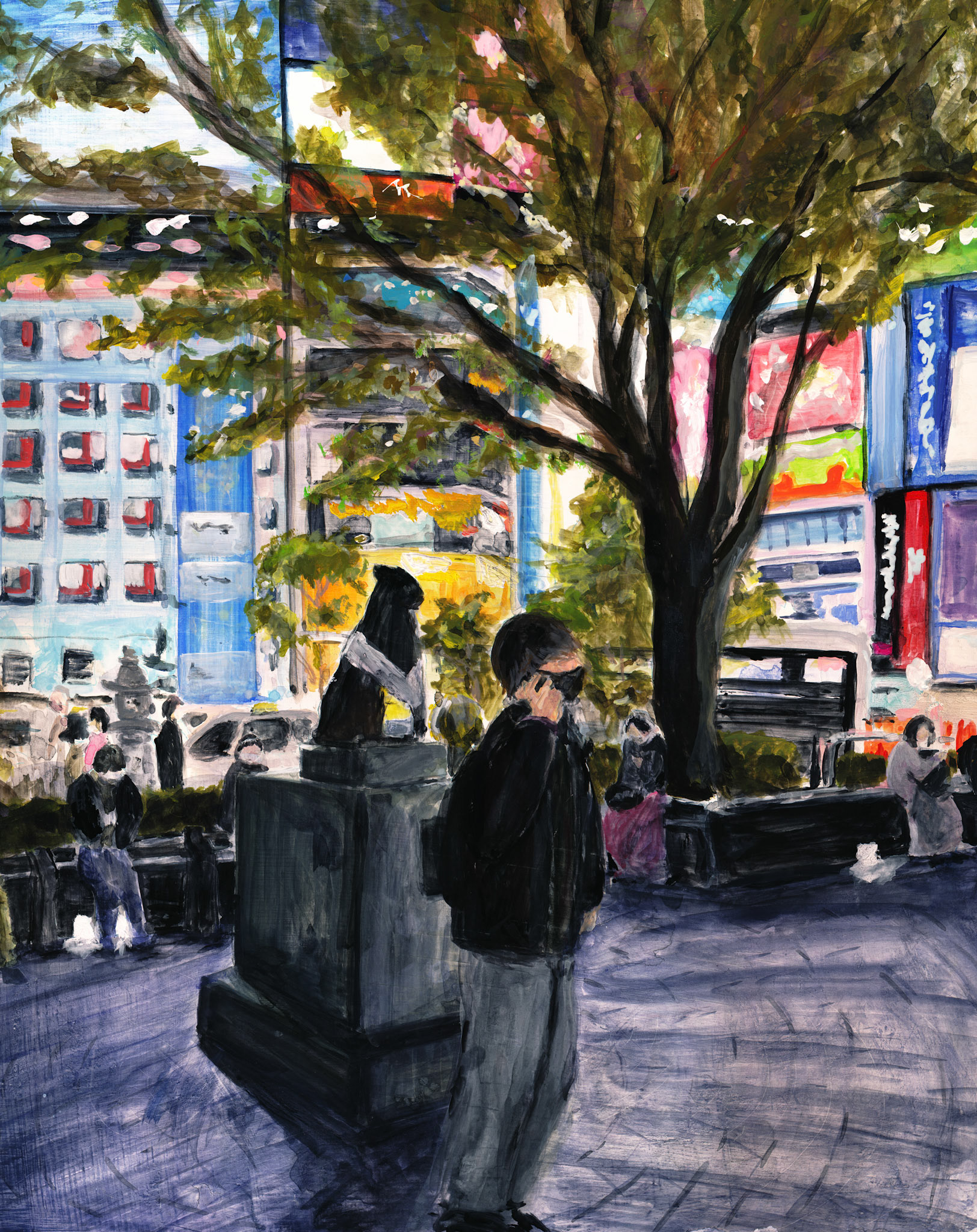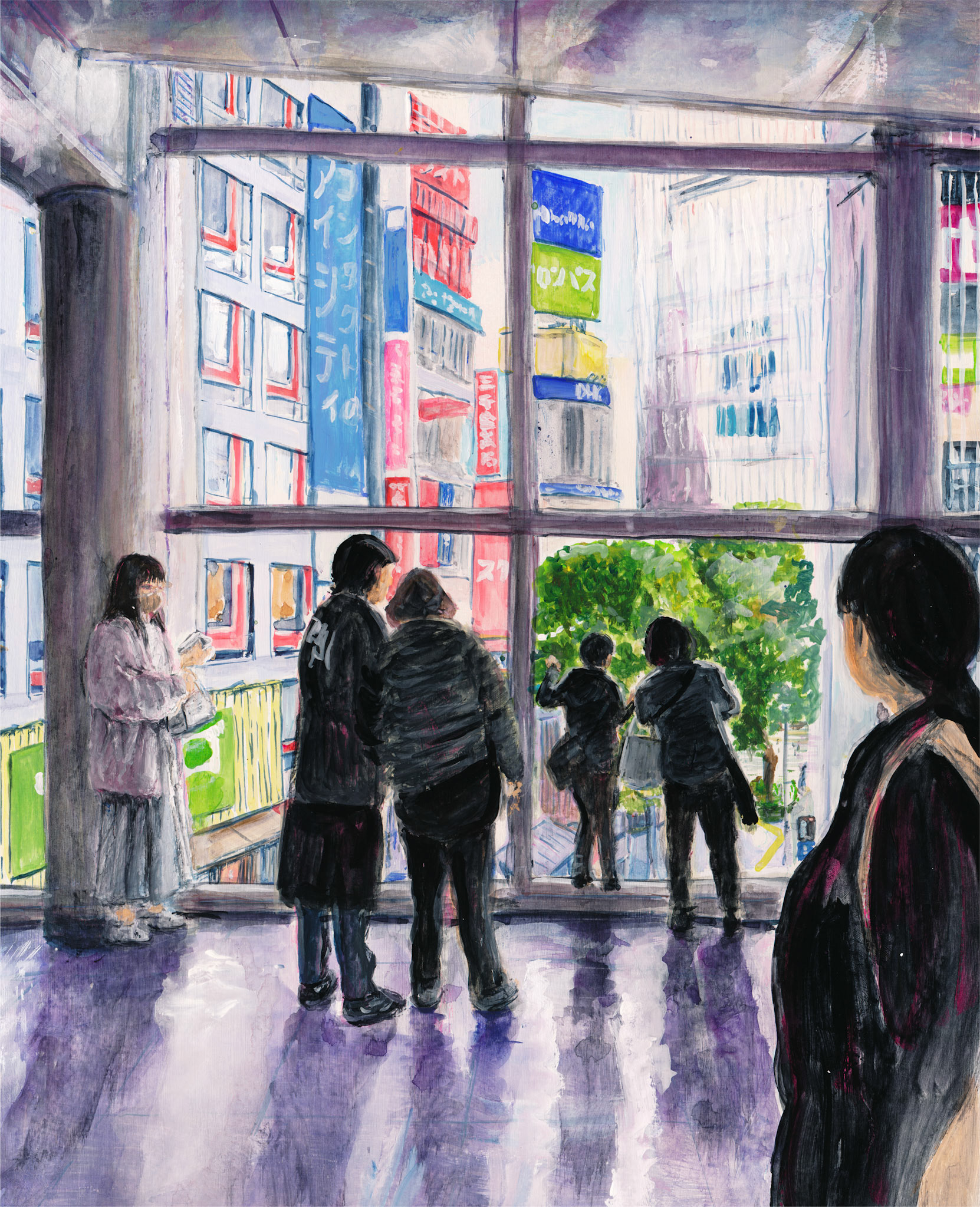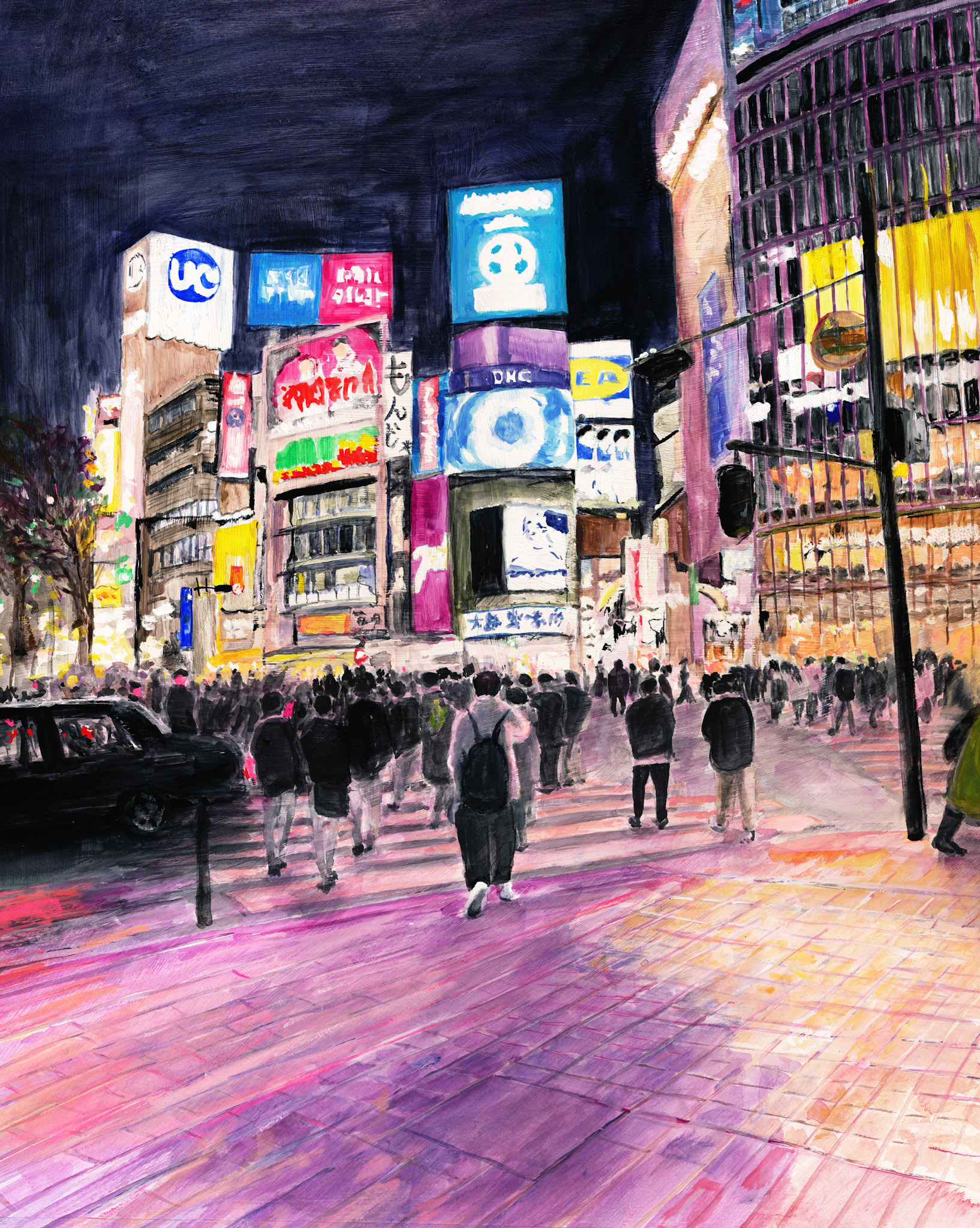This is a city intimately familiar to me—a place I visited for fun in my youth and now frequent for exhibitions. Here, the lives of countless people of all ages cross paths, creating a vortex of human energy and emotional stir. The scramble crossing, a symbol of this district, perfectly embodies this chaotic vibrancy. Yet, within that hustle, there exists a fleeting moment of calm—a sudden lull. In that instant, I feel as though the thoughts of the crowd are suspended and sealed in time. I chose this theme to express that "pocket of silence"—a quiet void hidden